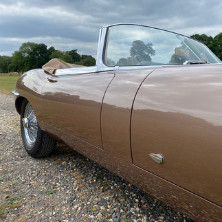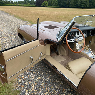 Jaguar E Type Series 1 Roadster 3.8 outside bonnet lock. LHD Finished in its original colour scheme of Bronze with beige interior. Fawn soft top with matching tonneau cover. This car was sold by Jaguar Cars New York to is first owner Mr J Barthom in Honolulu Hawaii. Having been brought back to the Uk, a full nut and bolt restoration has been carried out to the highest standards by the well renowned Rothwell Engineering. One of only around 300 outside bonnet lock cars, this represents an excellent investment opportunity especially as the heritage certificate shows it to be matching numbers and to be in its original colour scheme. Amazing looking car in pristine condition and in a great period colour.
