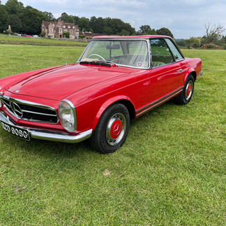 Mercedes 280SL Automatic Pagoda 1968 G registration. Signal red with matching hardtop and parchment leather seats. Only 76,000 miles with history to confirm. This is an original matching numbers right hand drive car with the California option of rear seats. Fully body restoration was carried out between 2007 and 2009 by the renowned Mercedes restoration specialist Tommy Heaney at a cost of 67,000 Euros. The engine was rebuilt in 2010 by Benjamin Lichtenberg Classics at a cost of 9500 Euros only three thousand miles ago.