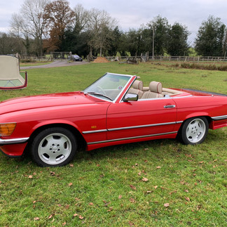Mercedes 107 500SL 1989 F registration. Signal red with beige leather interior piped in red. Matching red hardtop and black mohair soft top. This car is one owner from new and has only done 51,000 miles with full supporting history including every mot certificate from new, the original service book with stamps mainly from the Supplying Mercedes main dealer. Original book pack with spare keys etc, first aid kit, fire extinguisher, car cover, hard top stand, tool kit and original Blaupunkt Toronto with remote graphic equaliser. Supplied from new by the Mercedes factory with rare Lorinser side skirts, rear valence, wheels and steering wheel. Cruise control, front fog lamp, immobiliser, central locking, headlamp wash wipe, and standard rear spoiler. The soft top is the original Mercedes one which is in perfect condition and fits as it should. This car was purchased brand new by the one and only owner and is a very rare car indeed with exceptionally low mileage and wonderful provenance. Lovely condition throughout as you would expect. If the steering wheel is not to everyones taste I can supply a standard original and also the Lorinser kit can be removed, but in my opinion this car is the pinnacle of eighties cool.