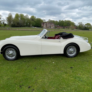 Jaguar XK 120 Drop Head Coupe Automatic 1953, Old English White with red leather interior and black mohair soft top. Original UK supplied right hand drive car with matching numbers. Wire wheels with spinners. This wonderful car is an older restoration in superb condition throughout. It is had many upgrades as the owners have undertaken European trips in it throughout their ownership. An automatic gearbox has been fitted at a cost of almost £16,000, it has adjustable electric power steering, disc brakes on the front with Cooper Craft callipers, aluminium radiator with electric fan, aluminium header tank, oil cooler. All the exterior lights have been upgrade to LED’s . Period bucket seats have been fitted which provide much more leg room then a normal XK120 making this a really comfortable car to travel any distance. The soft fits very well and is easy to operate, it also has a tonneau cover when it is down. The extensive history file of this car includes the buff log book, Heritage certificate, a tax disc from 1954, old mot;s, one from 1969, invoices and receipts going back to the sixties and all expenditure for the upgrades and other work done since the last owner purchased it in 2011.